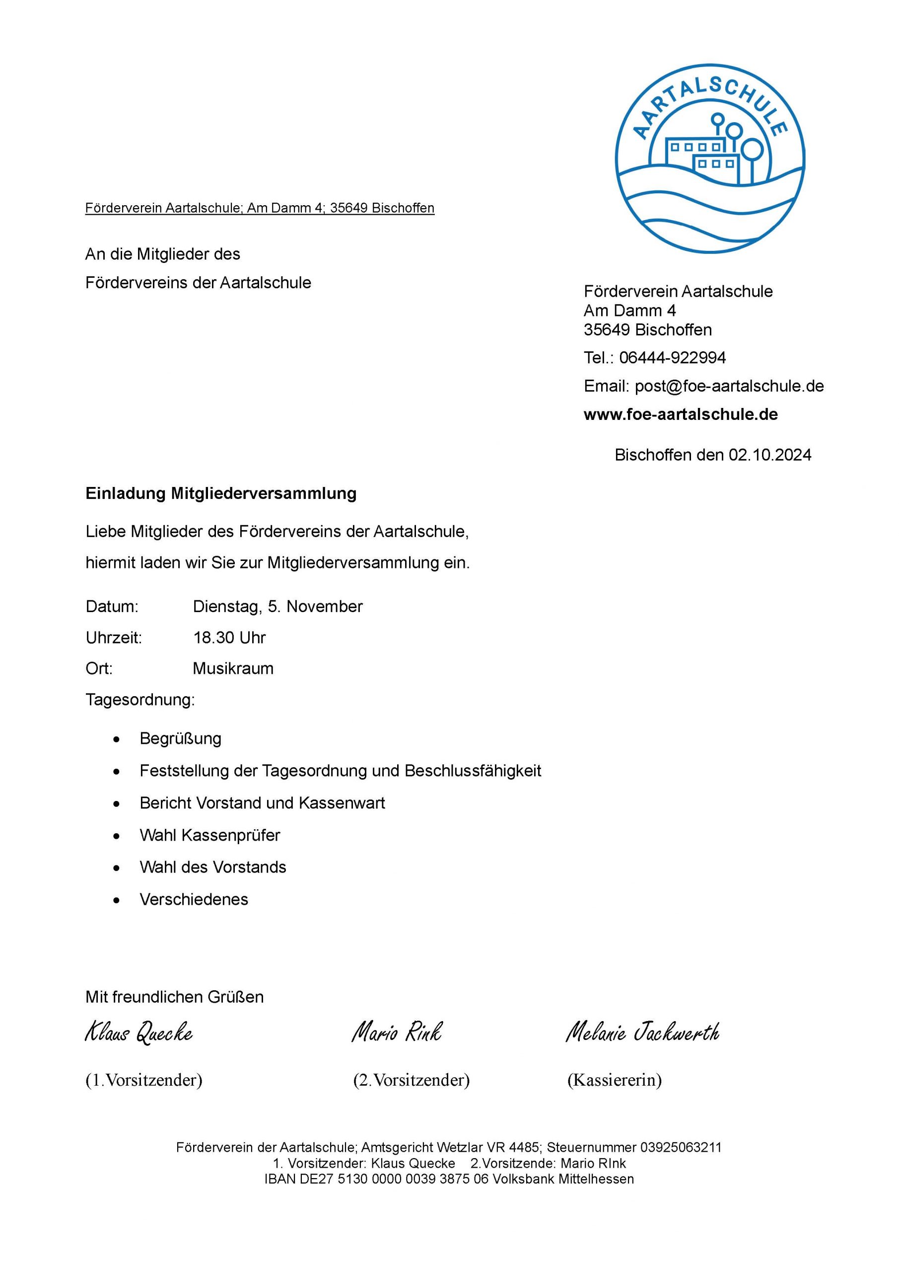 Am Dienstag den 5.11.2024 findet im Musikraum der Aartalschule die Mitgliederversammlung statt.